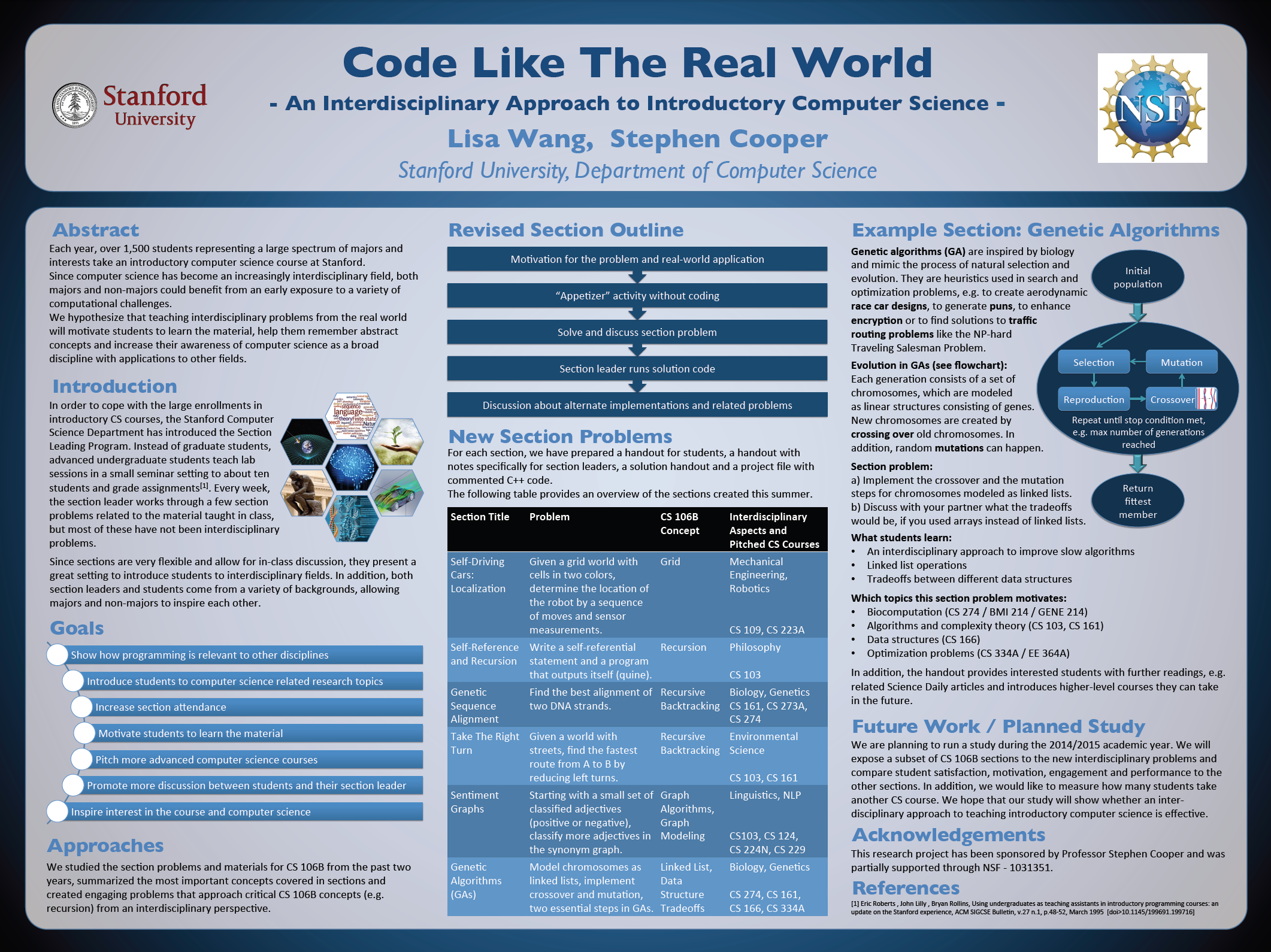 In Summer 2014, I did research in CS education with Prof. Stephen Cooper and created new interdisciplinary section problems for introductory CS courses at Stanford. We hope that teaching interdisciplinary problems from the real world will motivate students to learn the material, help them remember abstract concepts and increase their awareness of computer science as a broad discipline with applicationsto other fields.